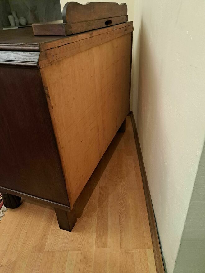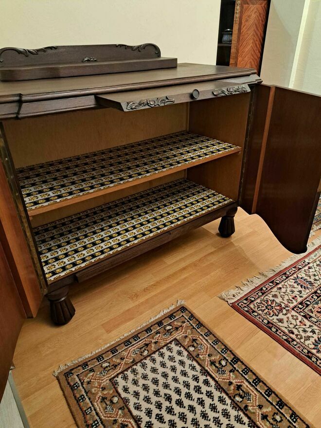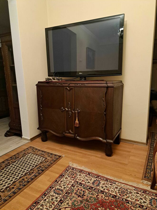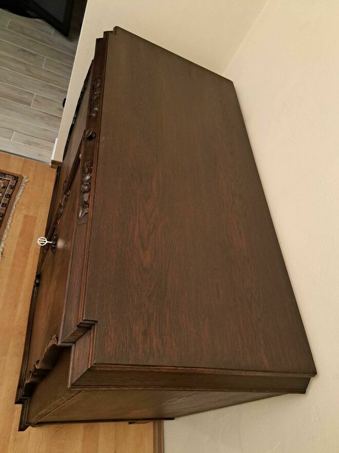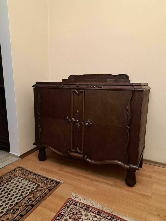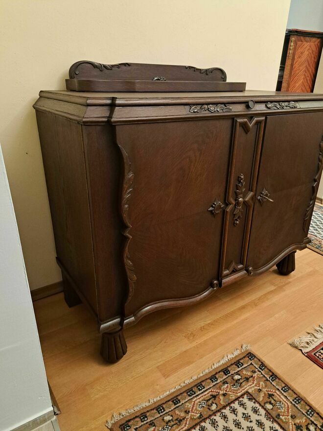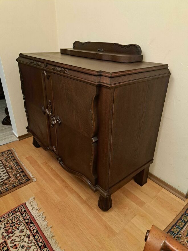 Piękna komoda z okresu secesji. W bardzo dobrym stanie. Bez śladów kornika ,bez ubytków i uszkodzeń. Po profesjonalnej renowacji . Wykończona górą koroną z rzeźbieniami. Może służyć jako bufet, komoda, pomocnik . W górnej części pod blatem półka wysuwana . Za drzwiami na całej długości półka .Stoi na masywnych wysokich nogach w kształcie żołędzi .Mebelek bardzo pięknie się prezentuje . Ozdobi każde pomieszczenie .WYMIARY : 120cm x 60cm x 97cm