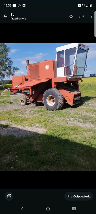 Witam sprzedam Bizona stan bardzo dobry - ma swoje lata ale rocznik 1981 słynął trwałość i, używany od początku w jednym gospodarstwie kosił 29 ha rocznie , tylko zboża. W razie pytań prosze dzwonić doślę foto. Posiada kabinę ( cała szczelna) i stół do rzepaku.Przemek