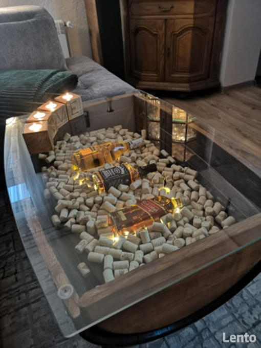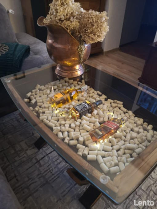 Ława z beczki po szkockiej whisky ze szklanym blatem. Korki po winie dolaczone sa do lawy.MOŻLIWOŚĆ WYBORU KOLORU WYKOŃCZENIA: